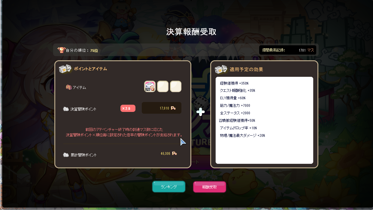 ・その他、ぬいぐるみを作ったり種集めたり、総合力とイベントボーナスに繋がる部分はがんばって準備してました。